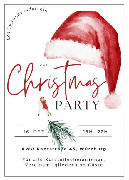 Wir veranstalten eine Weihnachtsfeier am 16. Dezember ab 19:00h im großen Saal der AWO. Alle Vereinsmitglieder, Kursteilnehmer:innen und ihre Gäste sind eingeladen.